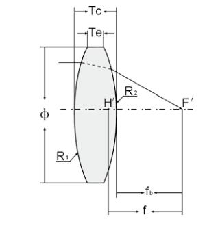 尺寸图说明: Φ- 直径,R1- 半径,Tc- 中心厚度,Te- 边厚,f- 焦距,fb- 背焦